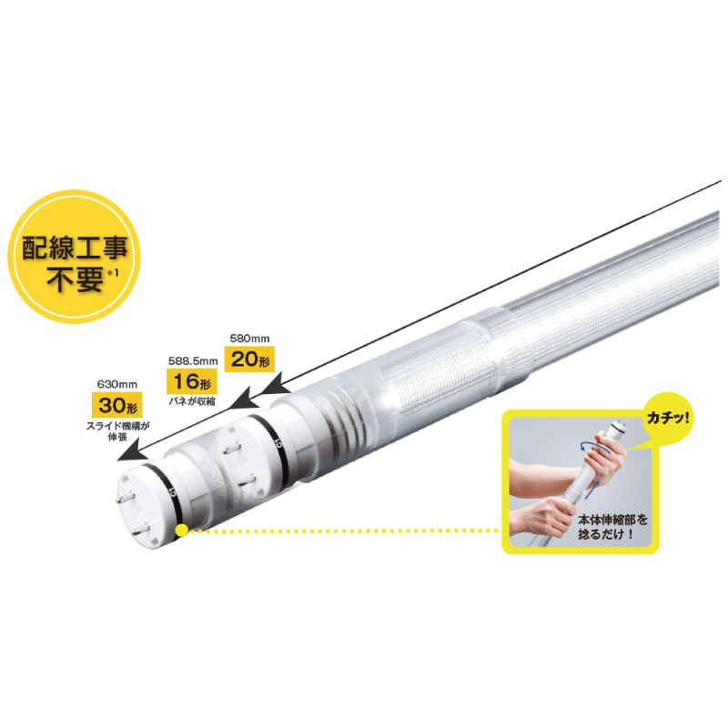 - 1本で16形・20形・30形の直管蛍光灯器具に対応(伸縮機構)