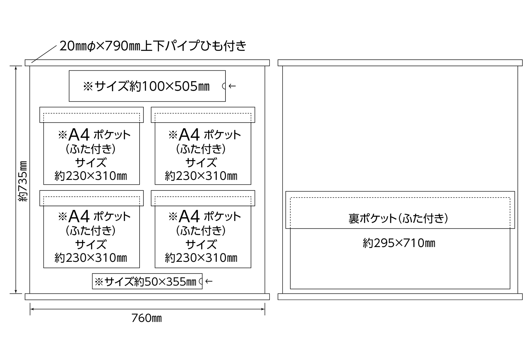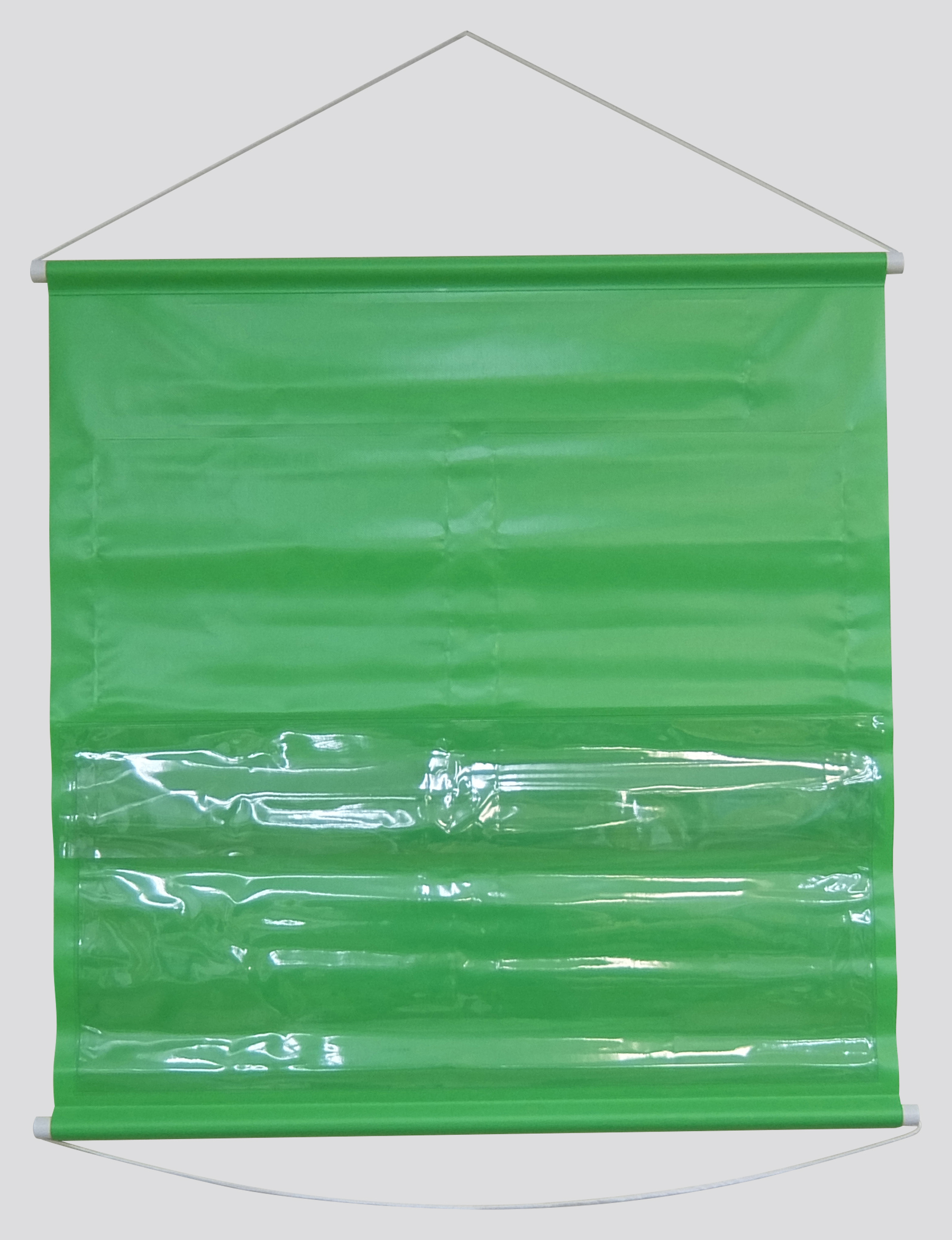 簡単に掲示板が完成!サイズ 約810×760㎜ 材質 本体:ターポリン ポケット:PVC 仕様 表面:A4横サイズポケット×4 裏面:ポケット×1 付属品 タイトル表示板(表示内容:安全掲示板)×1枚 社名用厚紙×1枚 上下パイプ ひも カラー 若草