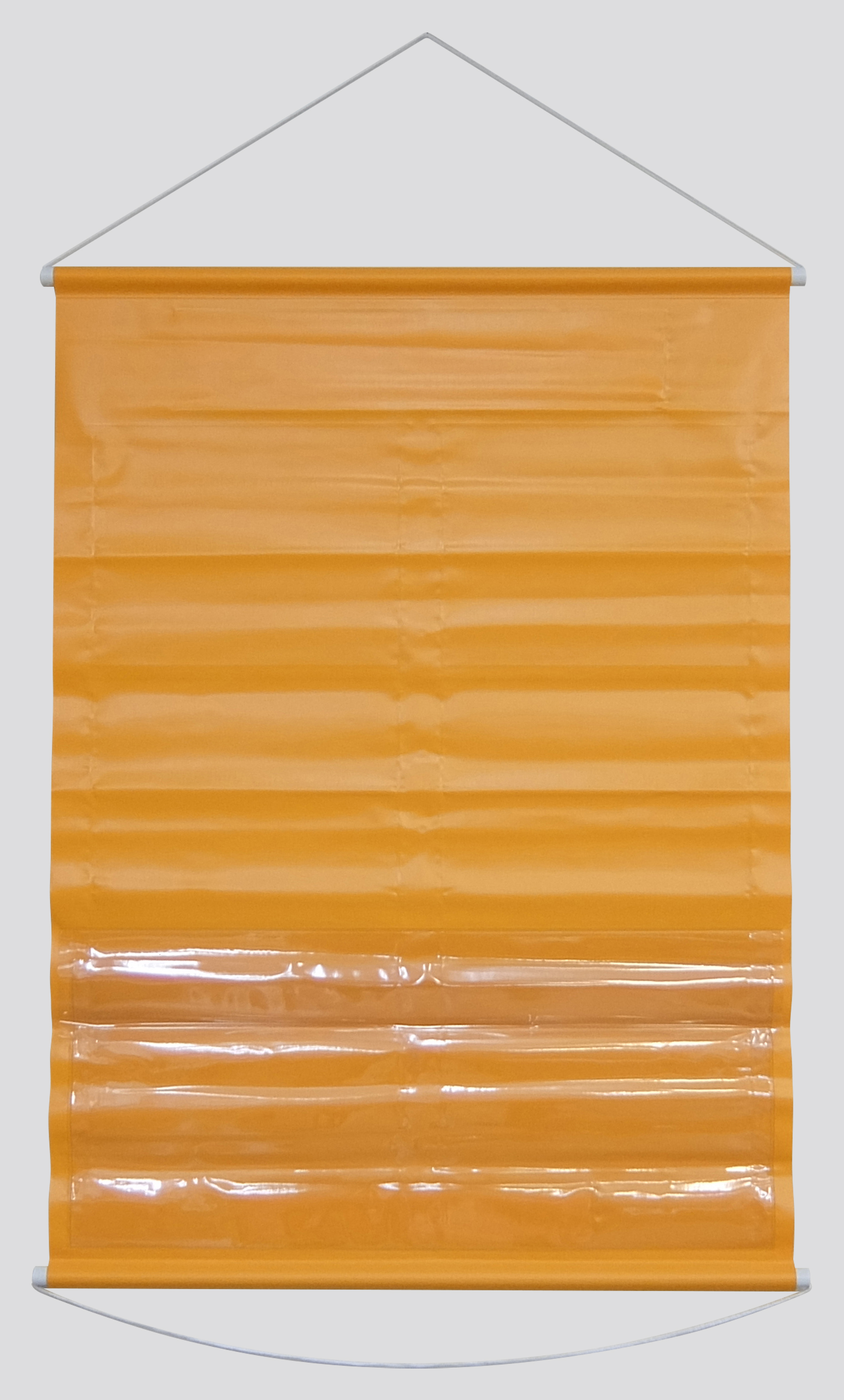 簡単に掲示板が完成!サイズ 約1075×760㎜ 材質 本体:ターポリン ポケット:PVC 仕様 表面:A4横サイズポケット×6 裏面:ポケット×1 付属品 タイトル表示板(表示内容:安全掲示板)×1枚 社名用厚紙×1枚 上下パイプ ひも カラー オレンジ