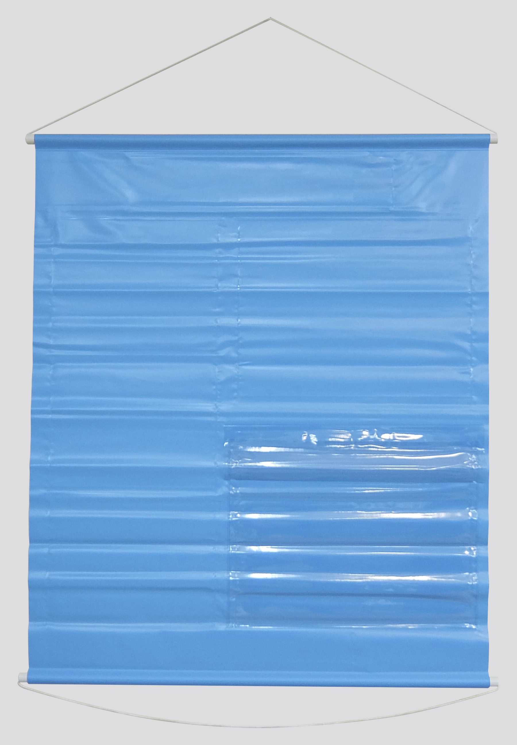 サイズ 約1075×870㎜ 材質 本体:ターポリン ポケット:PVC 仕様 表面:A3横サイズポケット×2・A4横サイズポケット×3 裏面:ポケット×1 付属品 タイトル表示板(表示内容:安全掲示板)×1枚 社名用厚紙×1枚 上下パイプ ひも カラー 水色