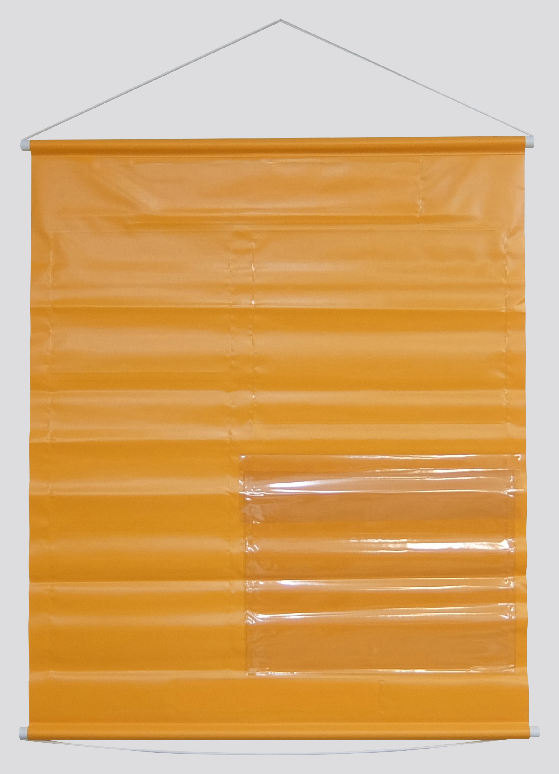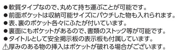 サイズ 約1075×870㎜ 材質 本体:ターポリン ポケット:PVC 仕様 表面:A3横サイズポケット×2・A4横サイズポケット×3 裏面:ポケット×1 付属品 タイトル表示板(表示内容:安全掲示板)×1枚 社名用厚紙×1枚 上下パイプ ひも カラー オレンジ