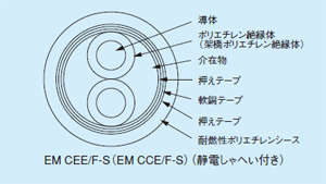 エコケーブル EM CEES/F ケーブル制御用ケーブル制御用架橋ポリエチレン絶縁耐燃性ポリエチレンシースケーブル(EM CCES/F) 特長・JIS認定品(JISマーク表示)規格JIS C 3401 定格6600V、90℃・ポリエチレン絶縁体及び耐燃性ポリエチレンシースは、ビニル(比重約1.4)との比重分別が可能な軽比重(約0.9~1.1)のため、リサイクルがしやすいです。・可とう性は、従来電線と同等です。・耐寒性は-50℃です。※しゃへい付きは、JIS規格外品ですのでJIS認定品ではありません。EM-CEESケーブルは、CVVSケーブルのエコケーブルです。制御用ポリエチレン絶縁耐燃性ポリエチレンシースケーブル可とう性は、従来電線と同等です。最近の公共工事ではCVVSケーブルの代わりにEM-CEESケーブルが使われるようになっていきています。