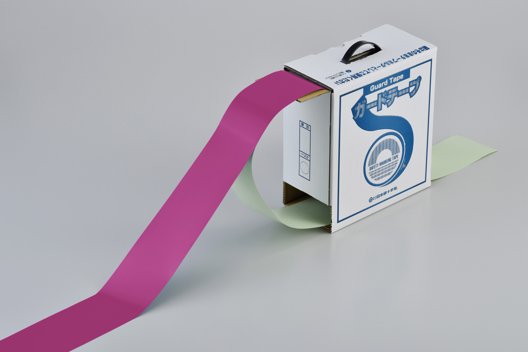 サイズ 100mm幅×100m 厚み 0.2mm 材質 オレフィン樹脂(表面ポリエステル加工) カラー 赤紫 室内床の区域表示用 ※100m巻は箱入り
