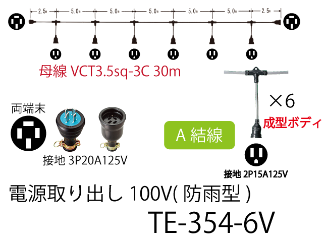 | TE-354-6V | 30 | 3.5sq-4C | 0.25 | 2.0sq-3C | 6 | 0 | ゴム防水接地3P20A | |