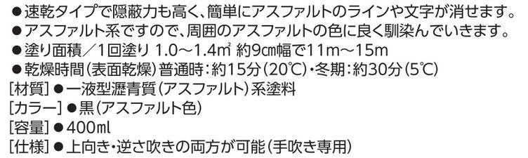 メーカー:日本緑十字社 材質 一液型瀝青質(アスファルト)系塗料 カラー 黒(アスファルト色) 容量 400ml 仕様 上向き・逆さ吹きの両方が可能(手吹き専用) ※スプレーライナーに取り付けての使用はできません。