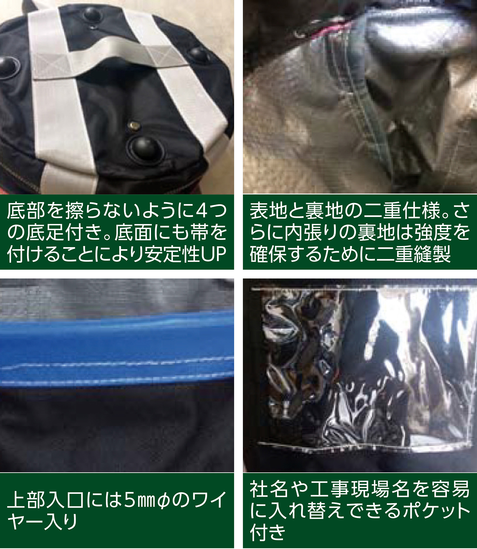 サイズ 350mmΦ×600mm 材質 表面生地・ベルト:ナイロン1680D 裏面生地:ターポリン 底板:スチール 入口部:5mmΦワイヤー 質量 2.5kg 仕様 最大荷重 100kg