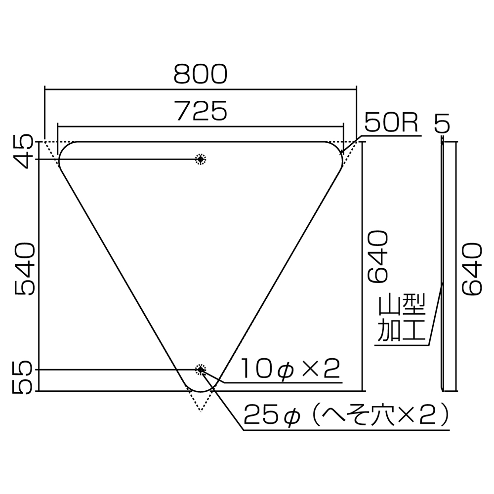 メーカー:日本緑十字社 サイズ 800mm三角×1mm 材質 スチール 仕様 10mmΦ穴×2(へそ穴) 山型 ※一般道での使用はできません。(構内のみでご使用ください)
