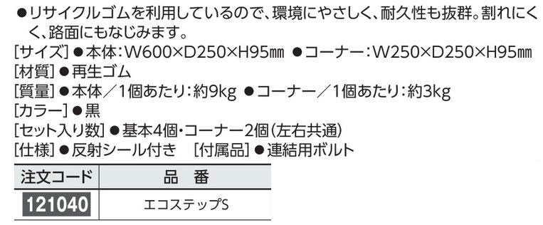 メーカー:日本緑十字社 サイズ 本体:W600×D250×H95mm コーナー:W250×D250×H95mm 1セット 材質 再生ゴム 質量 本体/1個あたり:約9kg コーナー/1個あたり:約3kg カラー 黒 セット入り数 基本4個・コーナー2個(左右共通) 仕様 反射シール付 付属品 連結用ボルト
