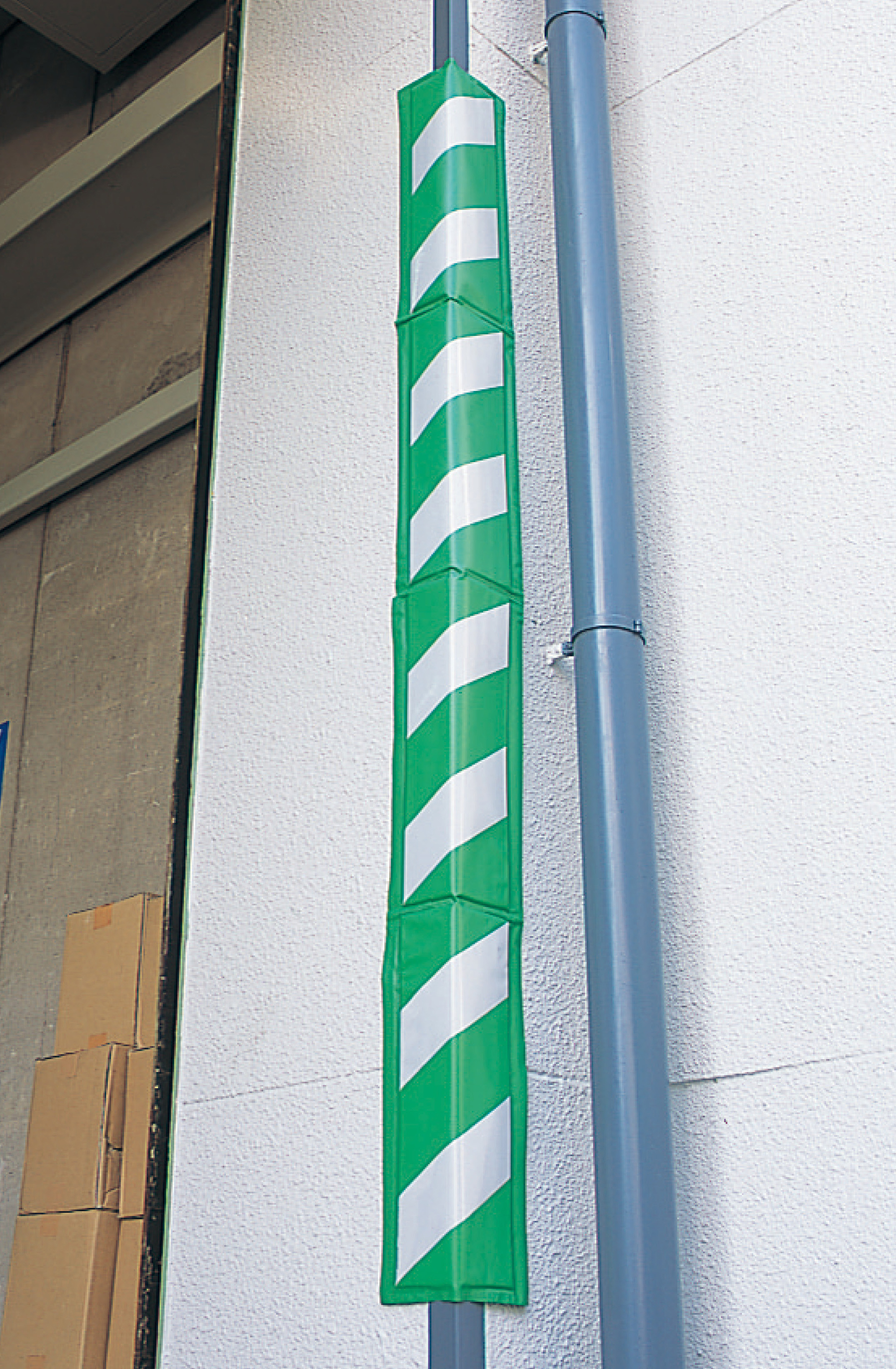 建物の凹凸部分に手軽に貼れ、危険標示とクッション機能で人や建物を保護します。駐車場や工事現場等の危険防止に。