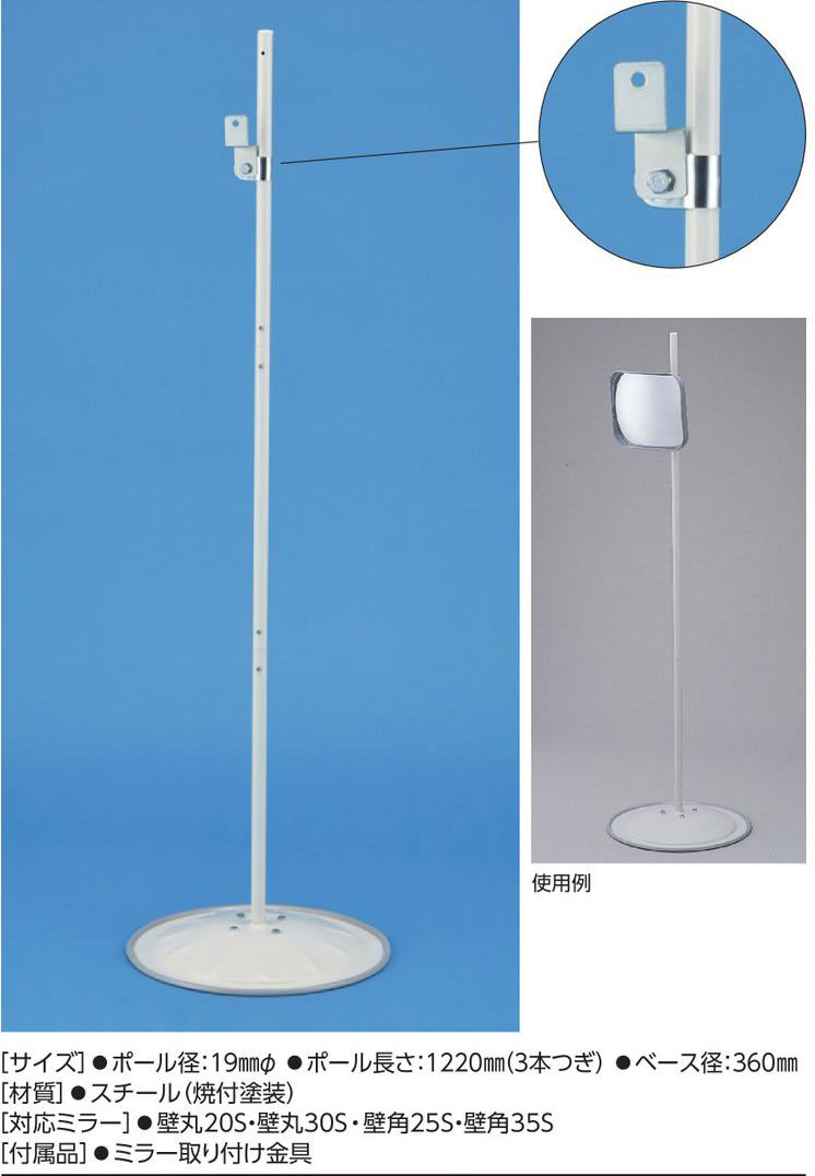 メーカー:日本緑十字社 サイズ ポール径:19mmΦ ポール長さ:1220mm(3本つき) ベース径:360mm 材質 スチール(焼付塗装) 対応ミラー 壁丸20S・壁丸30S・壁角25S・壁角35S 付属品 ミラー取り付け金具