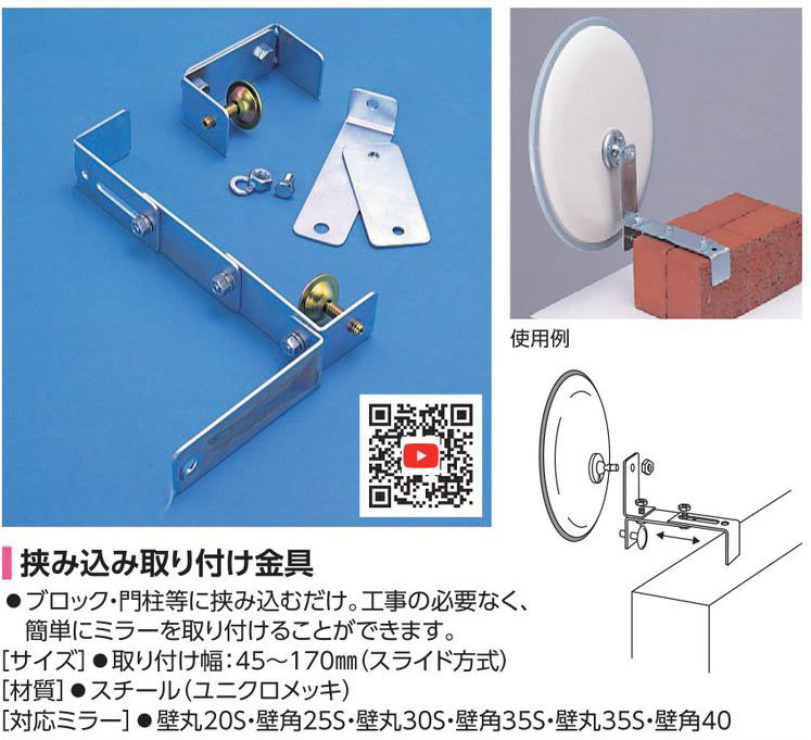 メーカー:日本緑十字社 サイズ 取り付け幅:45~170mm(スライド方式) 材質 スチール(ユニクロメッキ) 対応ミラー 壁丸20S・壁角25S・壁丸30S・壁角35S・壁丸35S・壁角40