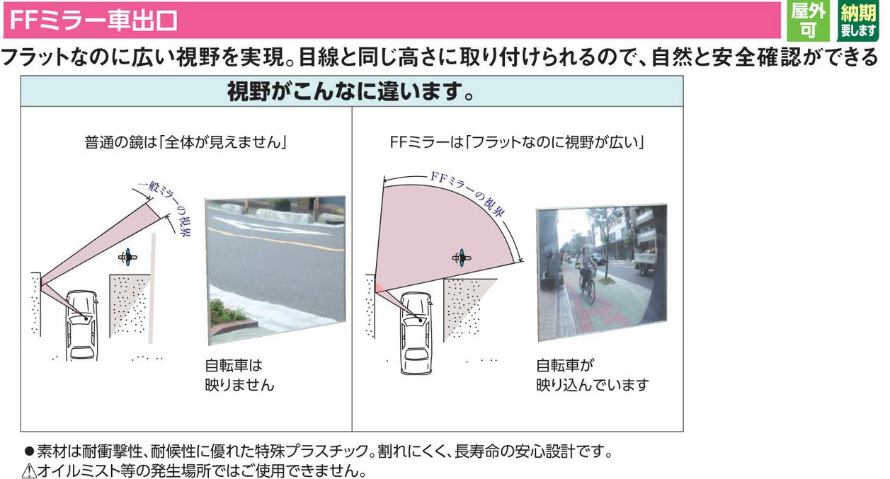 メーカー:日本緑十字社 サイズ 500×600×6.6mm 質量 2.2kg ミラー材質 特殊プラスチック 付属品 フレーム・ビス4本・ナイロンプラグ4個 取り付け可能壁面 凹凸があり、接着剤だけでは不安な壁面。