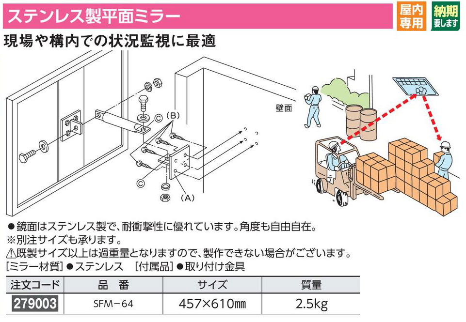 メーカー:日本緑十字社 サイズ 457×610mm 質量 2.5kg ミラー材質 ステンレス 付属品 取り付け金具