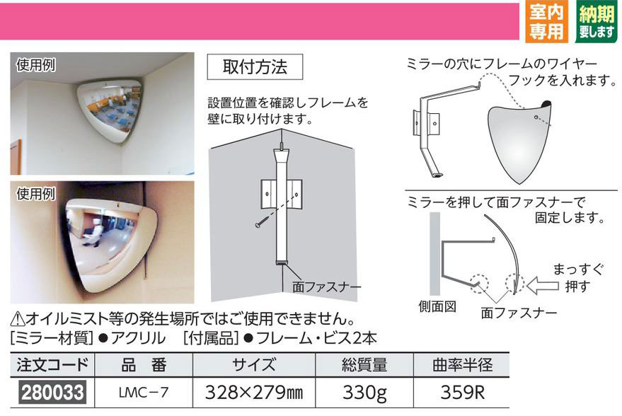 メーカー:日本緑十字社 サイズ 328×279mm 総質量 330kg 曲率半径 359R ミラー材質 アクリル 付属品 フレーム・ビス2本