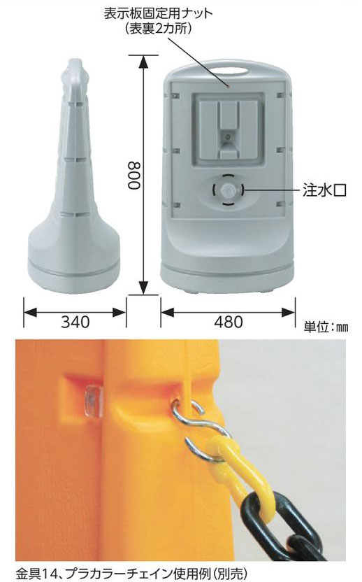 サイズ H800×W480×D340mm(表示板:470×390×1mm) 材質 本体:ポリエチレン 表示板:PET 質量 3kg(満水時:約34kg) 仕様 表示板固定用ねじ2個付き(ナット本体埋め込み) カラー イエロー ※表示板は片面のみとなります。両面表示が必要な場合は、お問い合わせください。(別途お見積もり)