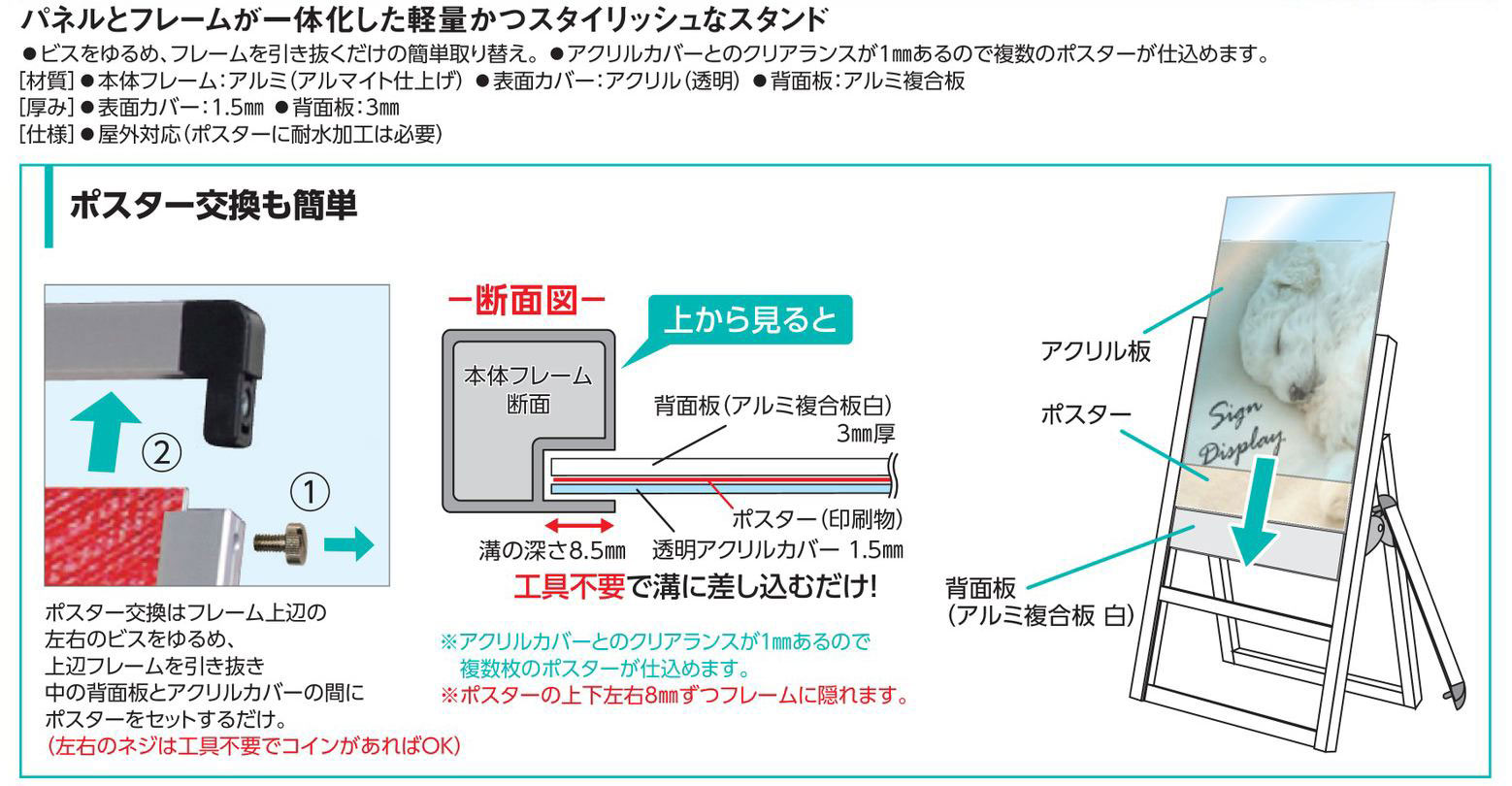 メーカー:日本緑十字社 サイズ 背面板サイズ・A2:594×420mm 面板有効サイズ:578×404mm カラー ブラック 質量 2.9kg 材質 本体フレーム:アルミ(アルマイト仕上げ) 表面カバー:アクリル(透明) 背面板:アルミ複合板 厚み 表面カバー 1.5mm 背面板:3mm 仕様 屋外対応(ポスターに耐水加工は必要)
