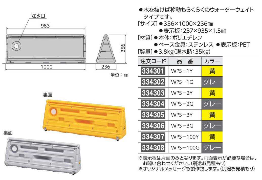 サイズ 356×1000×236mm 表示部:237×935×1.5mm 材質 本体:ポリエチレン ベース金具:ステンレス 表示板:PET 質量 3.8kg(満水時:35kg) カラー グレー ※表示板は片面のみとなります。両面表示が必要な場合は、お問い合わせください。(別途お見積もり)※オリジナルメッセージも製作いたします。(別途お見積もり)