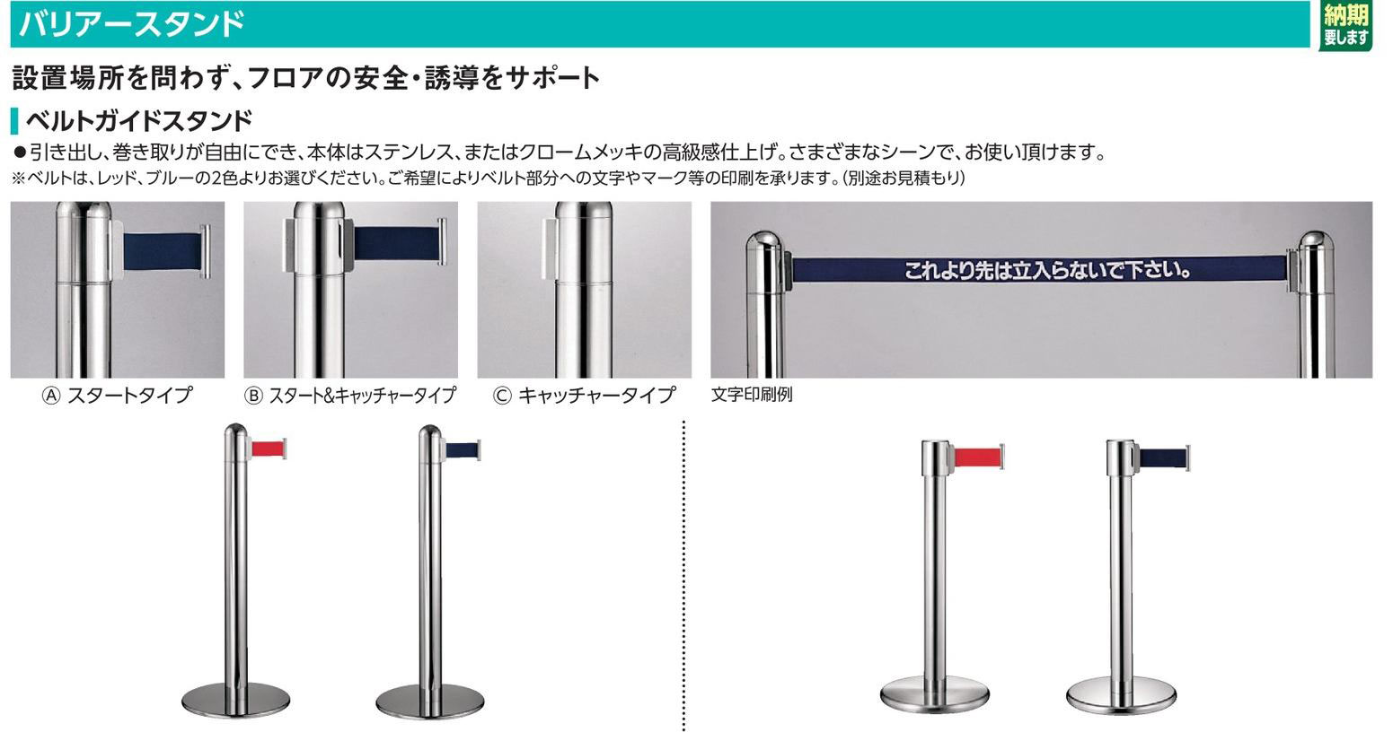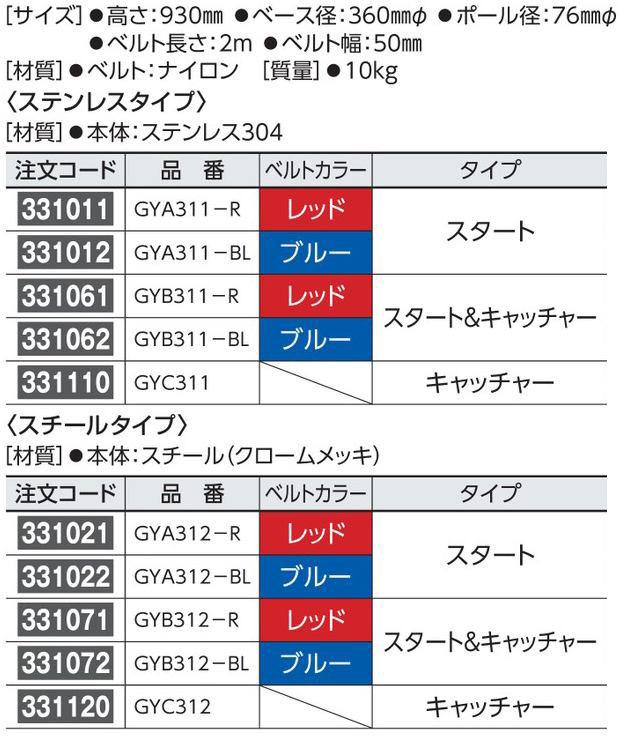 メーカー:日本緑十字社 サイズ 高さ:930mm ベース径:360mmΦ ポール径:76mmΦ ベルト長さ:2m ベルト幅:50mm 材質 本体:スチール(クロームメッキ) ベルト:ナイロン 質量 10kg ベルトカラー ブルー タイプ スタート&キャッチャー