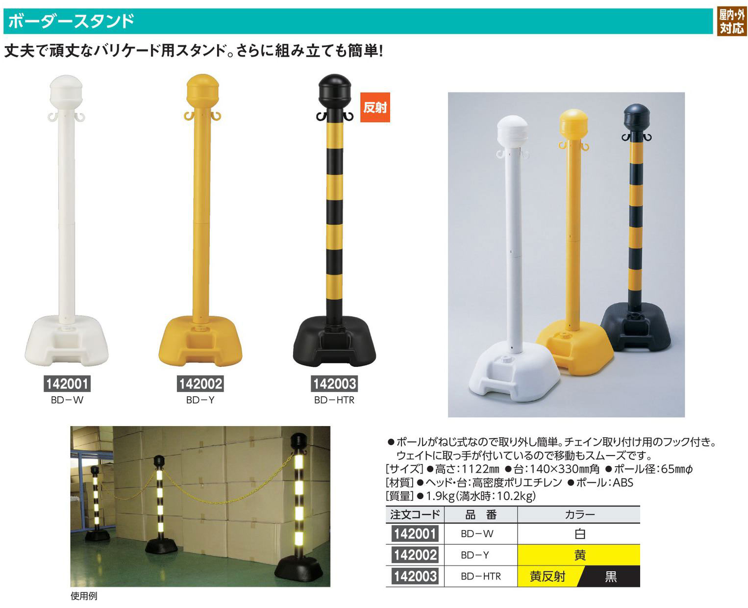 サイズ 高さ:1122mm 台:140×330mm角 ポール径:65mmΦ 材質 ヘッド・台:高密度ポリエチレン ポール:ABS 質量 1.9kg(満水時:10.2kg) カラー 黄反射/黒
