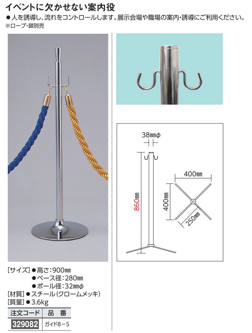 メーカー:日本緑十字社 サイズ 高さ:900mm ベース径:280mm ポール径:32mmΦ 材質 スチール(クロームメッキ) 質量 3.6kg ※ロープ・鎖別売
