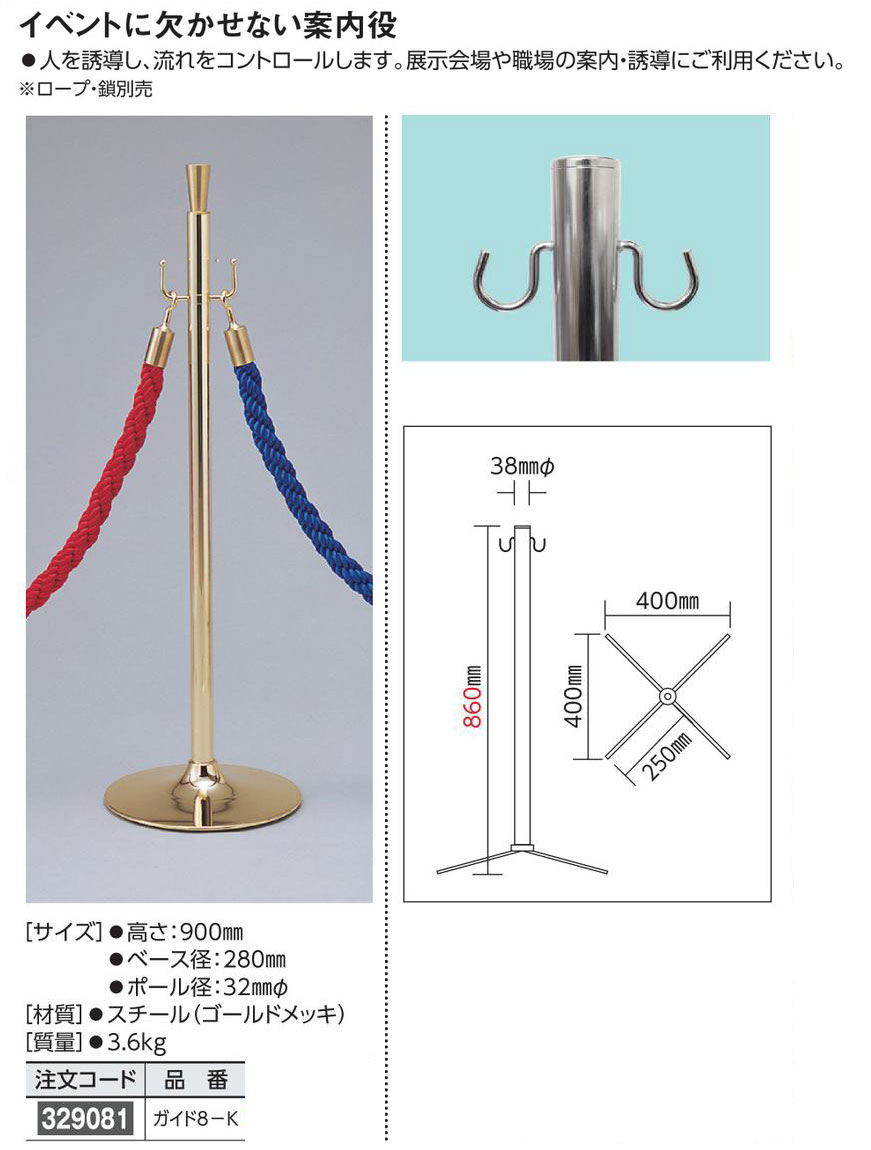 メーカー:日本緑十字社 サイズ 高さ:900mm ベース径:280mm ポール径:32mmΦ 材質 スチール(ゴールドメッキ) 質量 3.6kg ※ロープ・鎖別売