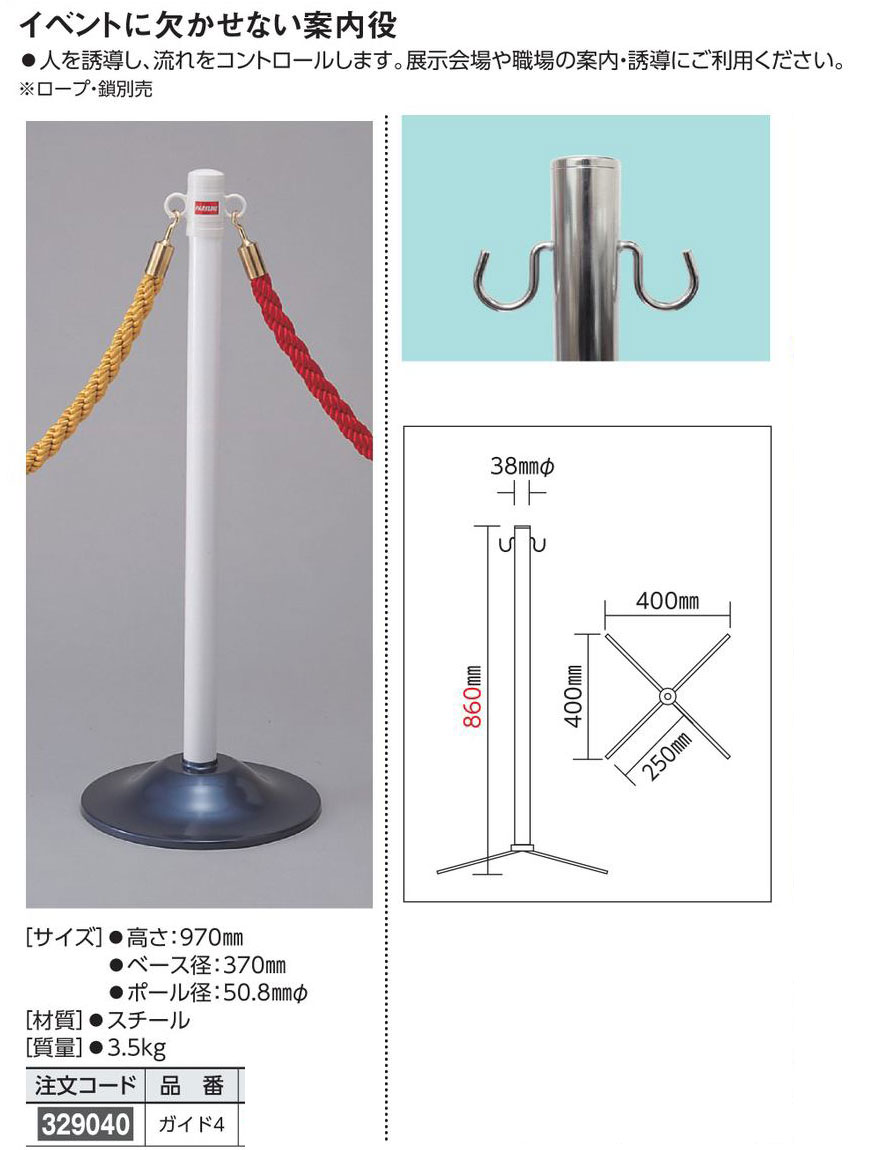 メーカー:日本緑十字社 サイズ 高さ:970mm ベース径:370mm ポール径:50.8mmΦφ 材質 スチール 質量 3.5kg ※ロープ・鎖別売